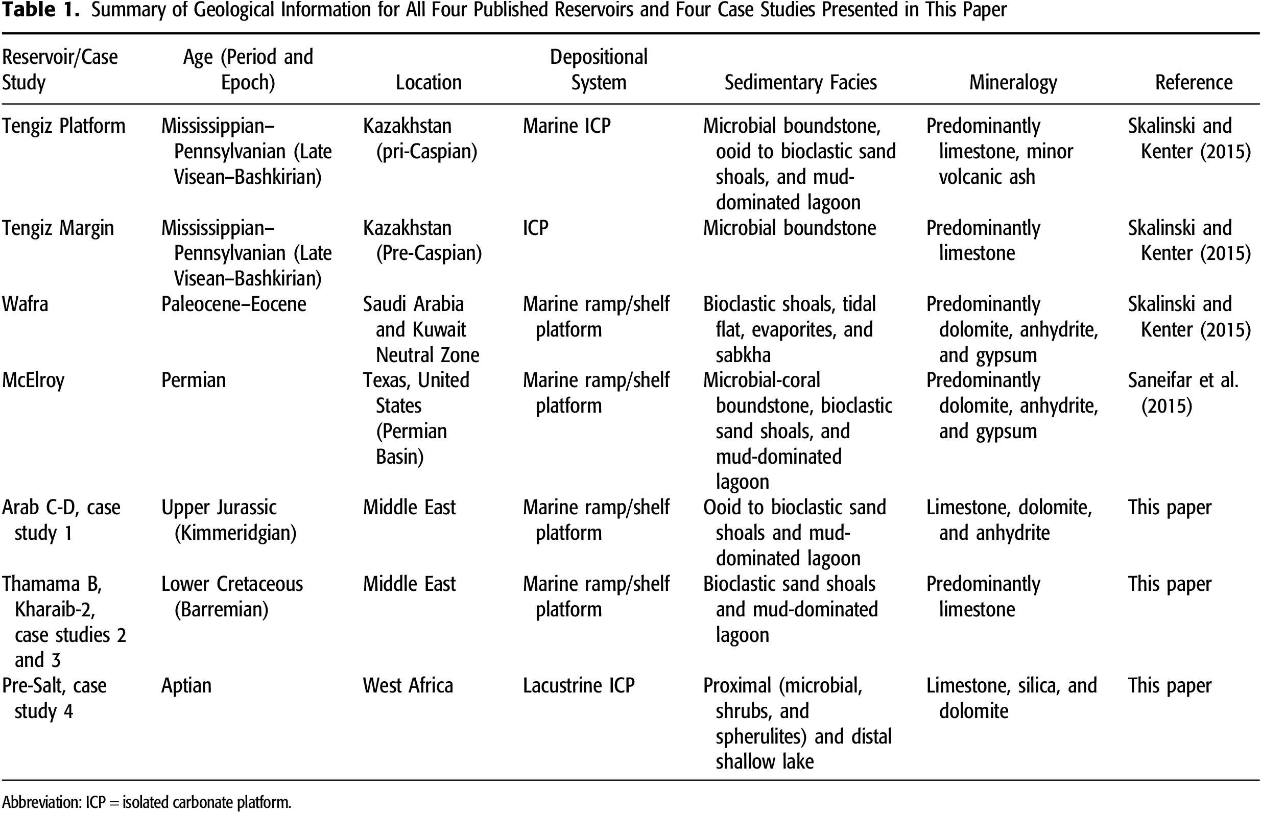 In addition to published work on this topic (Figures 1A, 2), this paper contributes another four case studies to test the geological link with the core-to-log domain and, more important, to investigate the observed trends and spatial juxtaposition of the FPRCs. As explained earlier, one of those case studies, the Middle East Arab C-D, was used for illustrating the workflow in the previous sections (Figures 4–8). The following is a brief review of the four case studies and integration with the four previously published case studies (Figure 3C, modified after Ahr, 2006 and Skalinski and Kenter, 2015) with a rock-typing approach that used similar published elements and concepts (Saneifar et al., 2015; Skalinski and Kenter, 2015). Generic information on all of the reservoirs is summarized in Table 1.