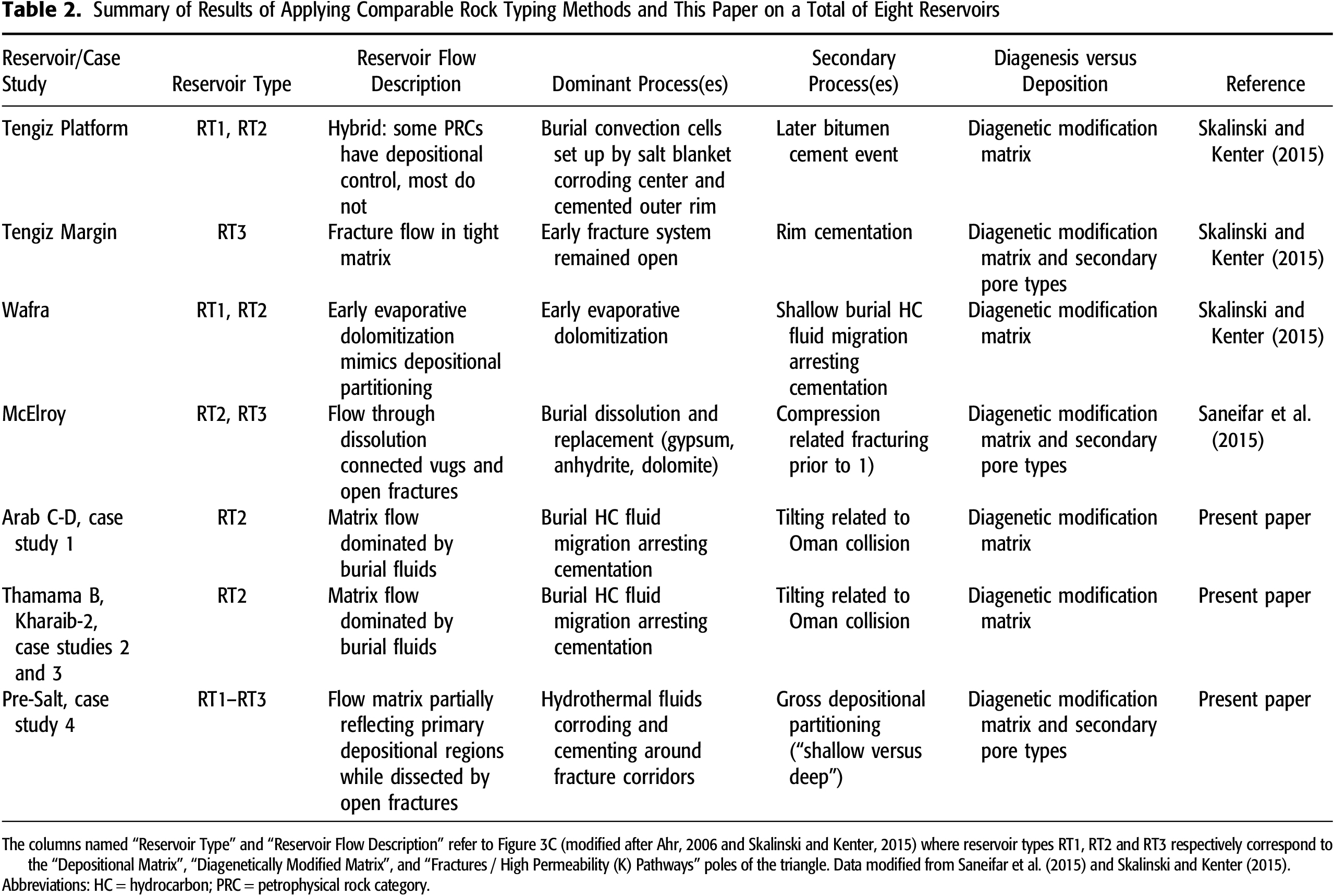 are interpreted to contain a measure of diagenetic influence that is nested in the primary controlling depositional attributes or rock types (e.g., Grötsch et al., 1998; Neo et al., 1998; Basioni et al., 2008; Lehmann et al., 2008; Rebelle et al., 2009; Lawrence et al., 2010; Warrlich et al., 2011; Salahuddin et al., 2016; Strecker and Ibrahim, 2017; de Ribet et al., 2018). Clearly, this approach has unresolved limitations in quantitatively defining the role of diagenetic modification to PTRDs and rock types, and hence, predictability (e.g., Francesconi et al., 2009; Skalinski et al., 2009).
