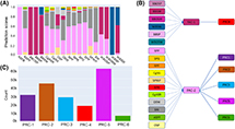Case study: Middle East Arab C-D. Nesting of the pore types (PT) in petrophysical rock categories (PRC) following prediction in the log domain displayed as bar diagrams (A) and graphics (B). (C) Summary of resulting final PRC (FPRC) proportions in the 250 wells used for this study. EFAC = electrofacies association category; FAC = facies association category.