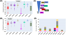 To review and identify processes that explain the observed spatial trends, a comprehensive review of the FPRC probability cube is required. Figure 10A shows the VPC of the FPRCs for the Arab C-D case study, and the trends very much resemble those of the lithofacies that are driven by depositional sequences resulting from changes in accommodation space. Although the waning and waxing of proportions may indeed be comparable, the FPRCs have, as explained earlier, no link with FAs. Interval 1 and interval 2 in Figure 10A (FPRC vertical proportions) represent very different parts of the reservoir. Corresponding FPRC lateral trends for these selected intervals are displayed as probability maps in the deterministic interpolation (Figure 10B, C). Here,
