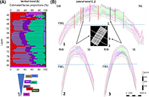 Case study: Data-dense Middle East Thamama B or Kharaib-2. (A) Vertical proportion curve showing a stratigraphic waning and waxing of reservoir quality (RQ)-based final petrophysical rock categories (FPRC) that resemble an intrinsic relative sea-level signal. The inverted triangle near the bottom shows the relative reservoir quality of the FPRCs. (B) Cross sections through a kriged representation of proportional (FPRCs) with original colors (see (A) as pastel version). Section 1 has a longitudinal direction, whereas sections 2 and 3 are transverse located in the northwest and southeast, respectively. Pastel green, pastel rose, pastel light pink, and pastel violet colors represent, respectively, FPRC8, -1, -5, and -9. FPRC5, -8, and -9 represent an increasing RQ and FPRC1 represents a very low RQ. FWL = free water level.