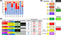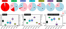 The FPRCs are defined by nesting the PTs into the previously defined PRCs that result from FACs and EFACs (see Figure 7B). The PTs could be from MICP (matrix pore system) or well logs (NMR or BHI) or the combination of all, depending on the data scenario. An example of a set of FPRCs is shown in Figure 8. Pie charts for mineralogy and ranges in porosity, permeability, and impedance for the remaining highly predictable FPRCs are shown in Figure 8 and form the basis for a relative ranking of the reservoir quality (Figure 7B). A final assessment of the relationship between FPRCs and FAs can be investigated by mapping the latter to the FPRCs (Figure 7A).
