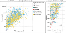 Matrix porosity versus permeability (left) and porosity versus burial depth (right) for more than 200,000 core measurements from a database with global and stratigraphic representativity partitioned by first order depositional texture.