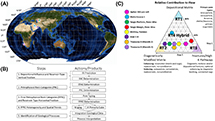 (A) Equal Earth projection showing the locations of the four case studies and four reservoirs from the public domain (using as template https://www.giss.nasa.gov/tools/gprojector/help/projections/). (B) Flow diagram explaining the preanalysis data scenario and subsequent five-step advanced rock typing road map. (C) The ternary diagram (modified from Skalinski and Kenter, 2014, Figure 3A) reports the relative contribution to flow of three main drivers and shows the reservoir types of four published reservoirs (Saneifar et al., 2015; Skalinski and Kenter, 2015) and the four case studies in this paper. Note that symbols and colors from (A) are used for display in (B) as well. AI = acoustic impedance; EFAC = electrofacies association category; FA = facies association; FAC = facies association category; Penn–Miss = Pennsylvanian–Mississippian; RT = reservoir type; SAG = sag-type basin formation during period of thermal subsidence.
