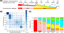 Case study: Middle East Arab C-D. (A) Depositional profile showing facies associations (FA)-1 to FA-8, which are lumped into predictable FA categories (FAC)-1 to FAC-4 resulting from the subsequent steps of the workflow; note that FA-8 and consequently FAC-4 are encountered in the log domain only. (B, C) Prediction results for FAs visualized by contingency table (B) and by stacked bars (C). Note that the blue box in (B) with the scores corresponds to that in (C). The white stars show the prediction of each FA into its own class. The mean prediction score is calculated as 35%.