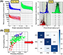 following multiresolution graph-based clustering analysis. (B) Subsequent prediction of pore types (PT) in the core domain. PHIK = porosity versus permeability cross plot; PSD = pore size distribution; SHg = saturation height.