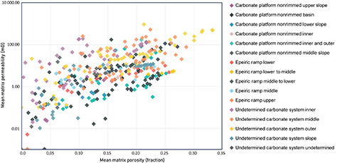 Figure 1. Mean porosity and permeability for distinct and spatially continuous bodies representing depositional nomenclature converted to standard depositional regions from static and corresponding dynamic models of more than 380 reservoir zones. Note that, while removing water depth for offshore wells is relatively easy and straightforward, stripping burial depth for onshore wells is highly biased by geological interpretation and therefore was not applied.