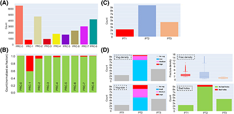 Figure 16. Case study 4: West Africa Pre-Salt Aptian. (A) Bar diagram showing proportions of nine, mutually exclusive, electrofacies, now labelled petrophysical rock categories (PRC). (B) Bar diagram showing “bad hole” attribute following analysis of borehole imagery, lost circulation, and excessive caliper observations. (C, D) Simple bar diagrams displaying three dominant pore types (PT) which represent both conductive fracture (Frac) density, pore size and density, and bad holes that can be predicted by logs. Novug = no vugs.