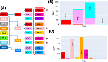 Figure 5. Case study: Middle East Arab C-D. (A) From left to right: facies associations (FAs), predictable FA categories (FACs), Electrofacies association categories (EFACs) nested in FACs, and petrophysical rock categories (PRCs) nested in EFACs. (B) Histograms showing the nesting of EFACs in FACs (250 wells). (C) Only four PRCs are considered relevant (stars) following review of their proportions in 250 wells studied.