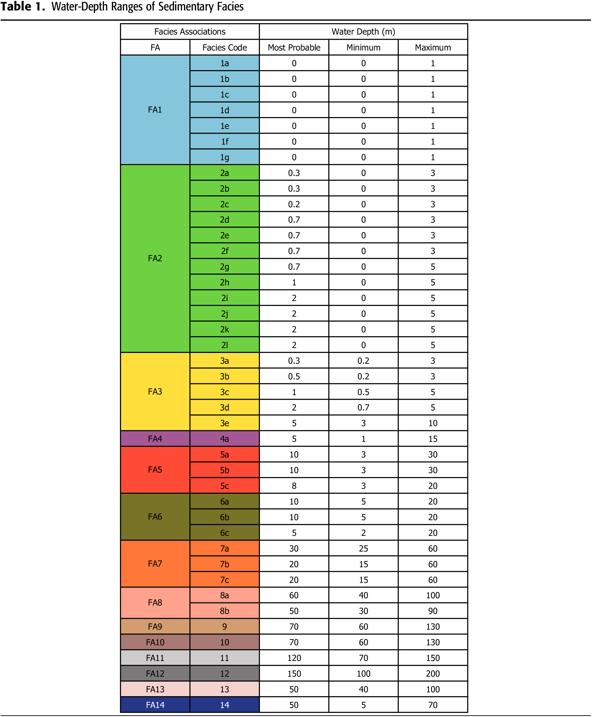 In this study, the water depths of sedimentary facies are considered as input data for the calculation of apparent accommodation. These depths have been attributed to each facies based on interpretations from Purdy (1961), Hughes (2000), Hillgärtner et al. (2003), Masse et al. (2003), Immenhauser et al. (2004), Burla et al. (2008), Bover-Arnal et al. (2012), Bastide (2014), and Michel et al. (2023), who studied analogous sedimentary systems (Figure 6). Three water-depth categories were defined for each facies (see Table 1), representing the most probable depth, the minimum depth, and the maximum depth. The most probable depth corresponds to the most common bathymetry found for each facies, based on literature and field observations. It represents the depth at which the facies are most frequently encountered in analogous depositional systems. The minimum and maximum depths represent the uncertainty ranges for the bathymetric deposition of the facies. The minimum depth corresponds to the shallowest deposition depth recorded, whereas the maximum depth represents the deepest depth still consistent with the facies characteristics. These ranges are derived from both the geological literature and the known water-depth ranges of the producers and elements associated with each facies.