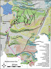 The current western Provence domain in southern France covers approximately 9000 km2. It is bounded by the Durance River, the Sainte-Victoire structure, and the Arc syncline to the east; by the Mediterranean Sea to the south; by the Carpentras Basin and the Crau Plain to the west; and, finally, by the Ventoux-Lure structure to the north (Figure 1). The study area comprises, from north to south by the Plateau d’Albion (altitude ∼850 m) and a series of east–west to northeast–southwest-trending folds and thrusts (La Nerthe, La Fare, Lubéron, and the Mont-Ventoux Lure structures). These are interrupted by north-northeast-trending strike-slip fault systems including the Nîmes, Salon-Cavaillon, Aix-en-Provence, and Mid-Durance faults (Tempier and Durand, 1981; Espurt et al., 2012).