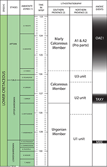 The Barremian to lower Aptian Urgonian carbonates in Provence were previously studied by d’Orbigny (1850), Leenhardt (1883), Masse (1976), Léonide et al. (2012), and Tendil et al. (2018). The stratigraphic units defined by the above studies depend on the geographic location.