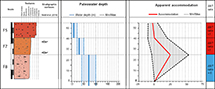 Consequently, values of apparent accommodation represent the evolution of the available space for sedimentation compared to the initial point, here referring to the base of a section. The finer the sedimentary descriptions are, the finer the vertical resolution of apparent accommodation is. Once the bathymetric and apparent accommodation curves have been built, increasing or decreasing trends emerge (Figure 4). A marker can then be placed at the interface between two different trends. Markers can be ranked according to the magnitude of the apparent changes.