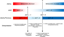 Definition and interpretation of the bathymetry-to-thickness ratio (ΔB/T). ΔAAC corresponds to the apparent accommodation differences between two markers.