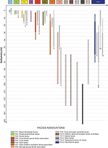 Graphical representation of the bathymetric range attributed to each facies associations and comparison with data from literature. Sources for bathymetry estimates: (1) Bastide (2014); (2) Masse et al. (2003); (3) Hillgärtner et al. (2003); (4) Burla et al. (2008); (5) Immenhauser et al. (2004); (6) Bover-Arnal et al. (2012); (7) Purdy (1961); (8) Masse (1976); (9) Rey and Cugny (1977); (10) Arnaud et al. (1998); (11) Hughes (2000).