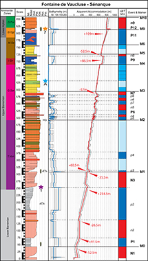 Apparent accommodation was calculated along each sedimentary section. The main evolutions obtained for Fontaine de Vaucluse (7 in Figure 1) and Martigues (3 in Figure 1) sections are shown below.