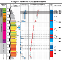 The M6 marker has been identified in middle and northern Provence only where it represents the top of an aggrading inner platform formed in a positive accommodation pattern during the late Barremian (M. sarasini ammonite subzone). In northern Provence, it corresponds to a major stratigraphic surface (D2 sensu Masse et al., 2011), resulting from subaerial exposure and correlated at Banon and Mont-Ventoux with basinal an aggrading interval (17 and 23, respectively, in Figure 1).