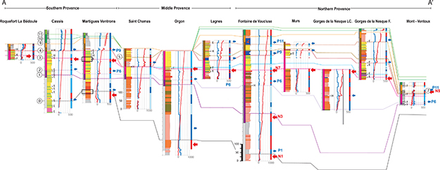 Figure 9. Correlation profile of the bathymetric and AA′ evolution from southern Provence to the western part of the northern Provence. See Figure 1 for location of the cross section. Ammonite zone dating and bathymetry-to-thickness ratio (ΔB/T) are also indicated. Surface numbers (black circles) correspond to marker number. Vertical scale is given along Saint Chamas sedimentary section. The black rectangles indicate the stratigraphic locations of the pictures shown in Figure 9. See Figure 3 for facies legend. Uppercase = major event; lowercase = minor event. E = exposure surface; F = firmground; Gorges de la Nesque F. = Gorges de la Nesque Fayol; Gorges de la Nesque LC. = Gorges de la Nesque Le Cire (see Léonide et al., 2012); H = hardground. N = negative accommodation events (red arrows); P = positive accommodation events (blue arrows).