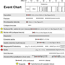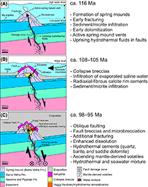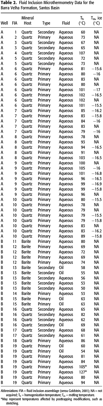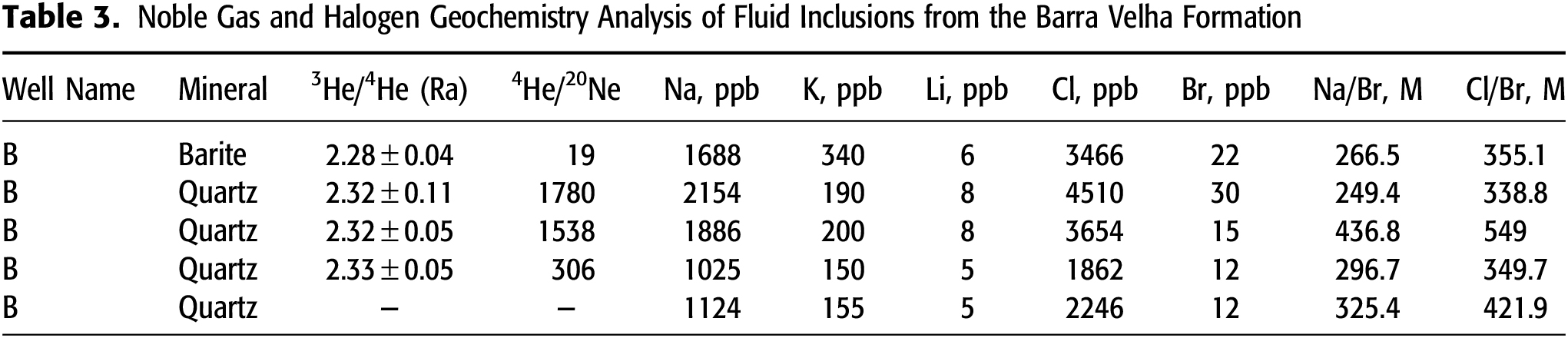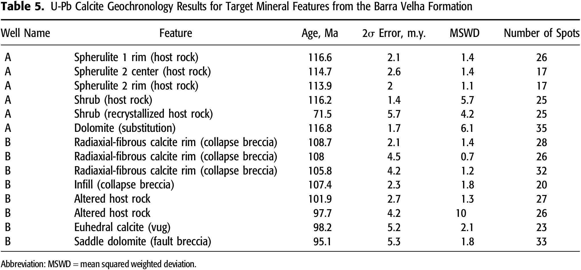 Here, we describe textures of the host rock and brittle structures and interpret the geochemical environment and timing of several diagenetic products. To achieve this objective, we used structural core description, petrography, fluid inclusions analysis (microthermometry, bulk crush-leach, noble gas analysis), carbon and oxygen stable isotope analysis, and U-Pb geochronology of carbonates in cores from two wells drilled in the Barra Velha Formation. We reconstruct the timeline of diagenetic events linking brittle deformation and hydrothermal alteration that affected the Barra Velha Formation, documenting the operation of hydrothermal processes that ultimately impact reservoir quality.