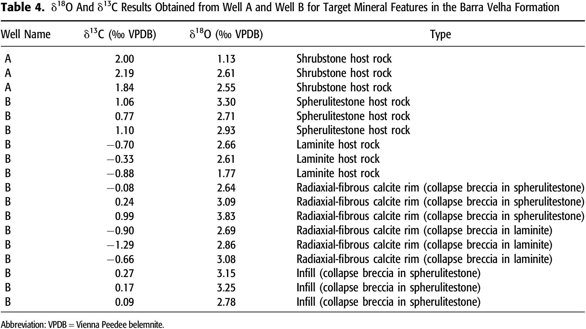 Pietzsch, R., L. R. Tedeschi, D. M. Oliveira, C. W. D. dos Anjos, J. C. Vazquez, and M. F. Figueiredo, 2020, Environmental conditions of deposition of the Lower Cretaceous lacustrine carbonates of the Barra Velha Formation, Santos Basin (Brazil), based on stable carbon and oxygen isotopes: A continental record of pCO2 during the onset of the Oceanic Anoxic Event 1a (OAE 1a) interval?: Chemical Geology, v. 535, 119457, 23 p., doi:10.1016/j.chemgeo.2019.119457.