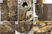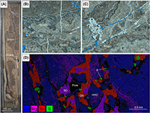 The predominant structural features in this core are collapse and fault breccias (Figure 7A, C). These appear in several core intervals and range from microscale to centimeter-sized clasts accounting for ∼30% of the core. Brecciated intervals can comprise up to 2 m of continuous length of the core.