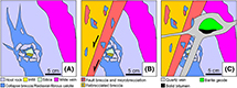 Published studies about the Barra Velha Formation suggest that fault damage zones (Chester and Logan, 1986; Caine et al., 1996) play an important role in fracture development and that some fractures are enlarged by dissolution leading to vuggy porosity (i.e., large open cavities in rock volume), although complete or partial porosity obliteration by cement also is common (e.g., Corrêa et al., 2019; Fernández-Ibáñez et al., 2022a, b; Wennberg et al., 2023). Available fracture studies of the area focus only on seismic or macroscopic description of the structures; therefore, fracture microscopic textures, their geochemical characteristics, and age are poorly understood. This lack of information commonly impedes subsurface interpreters in building accurate models. Such models should be constrained by a correct understanding of the brittle deformation and diagenetic processes in the pre-Salt oil fields.