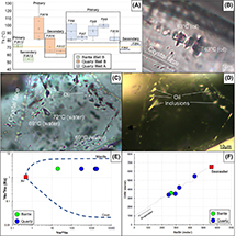 Fluid inclusion petrography was conducted using a Zeiss microscope equipped with an ultraviolet (UV) epifluorescence light (UV metal halide light source and 4′,6-diamidino-2-phenylindole filter) and 50× and 100× objectives combined with auxiliary lenses of ×1.6 and ×2.5. Fluid inclusions were classified based on their textural and spatial distribution into primary and secondary fluid inclusion assemblages (FIAs), following the genetic classifications of Roedder (1984), Goldstein and Reynolds (1994), Goldstein (2001), and Fall and Bodnar (2018). Microthermometry followed the procedures described in Goldstein and Reynolds (1994). For microthermometry, we used both a Fluid Inc.–adapted US Geological Survey–type gas-flow heating/freezing stage on an Olympus B ×41 microscope, and a Linkam THMS600 heating/freezing stage mounted on the Zeiss microscope. Both stages were calibrated using synthetic fluid inclusions (H2O-CO2 and pure H2O with critical density), and data were obtained with precisions of ±0.1°C for both stages.