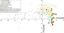 Révész, K. M., and J. M. Landwehr, 2002, δ13C and δ18O isotopic composition of CaCO3 measured by continuous flow isotope ratio mass spectrometry: Statistical evaluation and verification by application to Devils Hole Core DH-11 calcite: Rapid Communications in Mass Spectrometry, v. 16, no. 22, p. 2102–2114, doi:10.1002/rcm.833.