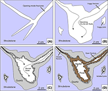 Sequence of brittle deformation events in well A based on crosscutting relationships. (A) Fractured silica layers and small displacement faults showing cataclastic texture and clasts of host rock within a dark matrix. (B) Opening-mode fracture filled with microcrystalline infill that is dolomitized. (C) Chalcedony and megaquartz veins showing irregular walls and quartz geodes, with preserved porosity. Fragments of host rock wall are cemented within chalcedony cement. Megaquartz cement can be found filling some fractures without the earlier chalcedony phase. Solid bitumen is commonly the final filling in fractures. Pore is commonly preserved where fracture widths are large.