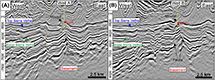 Seismic sections in depth showing the locations of wells A and B. Both wells were drilled in carbonate mounds that are rooted by deeply faulted basement and reservoir blocks. Well trace is in yellow; core positions are shown by red rectangles. (A) East-west seismic section with location of well A. (B) East-west seismic cross section with location of well B. Note faults displacing the top of the Barra Velha Formation.