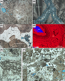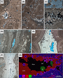 The first event observed is fractured silica layers bearing opening-mode fractures spanning bed thickness (Figure 6A). The following events are small displacement faults, with cataclastic texture usually having a high dip angle (>85°). Subsequently, opening-mode fractures cut the older structures, and show microcrystalline infill that is largely dolomitized (Figure 6B). The youngest observed structures are the vuggy fractures that are evidence of dissolution of fracture walls, followed by an initial chalcedony cementation that usually contain cemented pieces of broken fracture walls (Figure 6C). Megaquartz cementation follows, and some fractures are filled only by megaquartz. Solid bitumen can be found as the latest phase of fracture infill. In cases in which the fracture aperture is large (>1 cm), open pores are preserved within geodes.