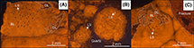 The cathodoluminescence images from host rock depositional shrubs and spherulites show a consistent orange color through the crystals and small (0.1–0.2 mm), dark luminescence areas that do not seem to be relevant in volume (Figure 5A, B). At one of the samples from well A we detected consistent changes in cathodoluminescence (Figure 5C).