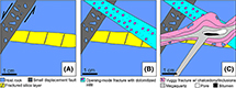 Small displacement fault: fault showing centimetric or millimetric shear displacement (i.e., wall parallel movement) and cataclastic texture.
