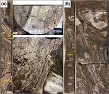 Well A has a total of 10.6 m of core length. Although we studied the entire cored section, most of our work focused on one representative part of ∼4 m, where we could clearly observe intensive brittle deformation with vuggy fractures (e.g., Nelson, 2001) and cavities lined by euhedral quartz (i.e., quartz geodes). In addition to this core, we obtained a spherulitestone sample from a drilled plug, located deeper and ∼250 m below the core position in well A, in the lower Barra Velha Formation, to be used specifically for petrography and geochronology. Well B has a total of 99.39 m of core length. Our studies focused on one interval of 15.8 m, where we observed intensive brecciation and faults.