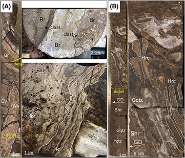 Figure 8. Wide brecciated crack-seal veins in well B. (A) Wide vein (Wv) with brecciated aspect and several phases of calcite cement. Contact with silicified spherulitestone (SiSph) host rock is irregular. Late quartz veins (Qv) cut wide calcite veins and host rock. Lower detail: Recracked fractures (Rf) formed by crack-seal and internal brecciation (IBr) appear to have been the predominant process. Upper detail: A breccia texture (Br) is observed just above the wide vein on the top of the core, showing rebrecciation evidence in the form of breccia clasts in younger breccias. (B) Wide brecciated vein with several clasts of host rock (Hrc) in the vertical position cemented with grayish quartz (Gqtz). On the top, the clasts lack organization. A shrubstone (Shr) is cut by the vein and shows horizontal shrub growth direction (GD). Yellowish quartz vein (Yqtz) cuts the shrubstone locally.
