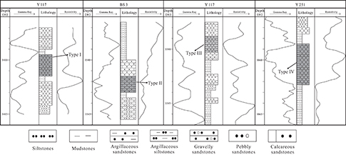 Figure 17. Depth profiles of lithologic column and well logs for the sandstone reservoirs in the third interval of the Paleogene Shahejie interval in the Bonan oil field showing the difference of gamma ray and resistivity well logs for the four types of sandstone reservoirs.