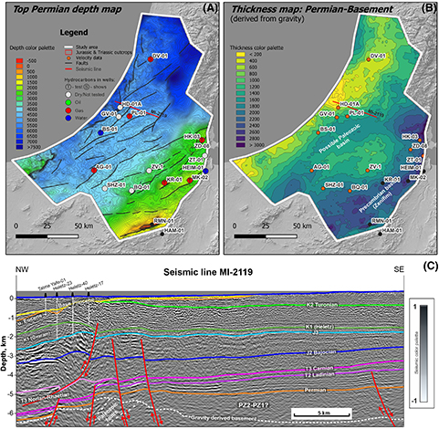 Figure 10. (A) Top Permian (Arqov Formation) structural map. (B) Isopach map of the sequence between the Permian and basement. (C) Seismic section showing the thickness change of the Triassic–Permian sequence. J = Jurassic; K = Cretaceous; PZ = Paleozoic; T = Triassic; u. Eocene = upper Eocene.