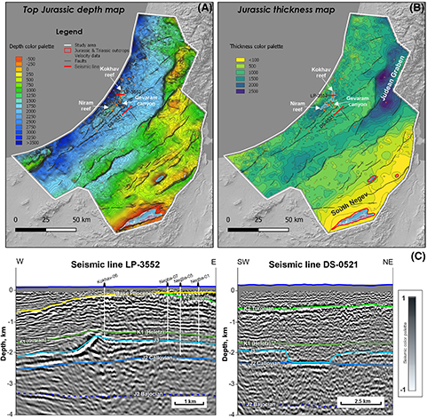 Figure 12. (A) Top Jurassic structural map. (B) Isopach map of Jurassic sequence. (C) Seismic section through the Jurassic Carbonate reef (LP-3552) and erosional Gevar-Am channel cutting into the Upper Jurassic (DS-0521). J = Jurassic; K = Cretaceous.