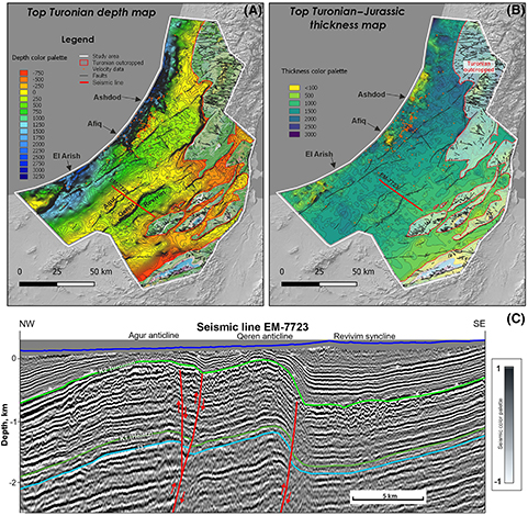 Figure 13. (A) Top Turonian structural map. (B) Isopach map of Turonian–Jurassic sequence. (C) Seismic section showing the reverse faults under the northern Negev structures. Note the onlaps in the adjacent synclines that indicate the structural activity during deposition (Senonian age). J = Jurassic; K = Cretaceous.
