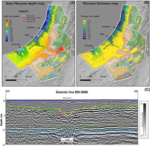 Figure 15. (A) Base Pliocene structural map. (B) Pliocene isopach map. (C) Seismic section showing the erosive Afiq canyon. J = Jurassic; K = Cretaceous; u. Eocene = upper Eocene.