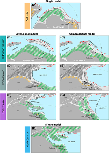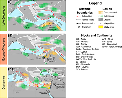 Figure 3. The compilation of existing tectonic models for pre-Paleozoic to present. The positions of Gondwana, Baltia, Greenland, and North America have been taken from GPlates models (Scotese and Wright, 2018; Cao et al., 2024). The basis of the extensional model was adapted from Stampfli and Borel (2002); the compressional model was adapted from Şengör et al. (1984), van Hinsbergen et al. (2020), and Siegesmund et al. (2021). All of the models were simplified to provide general understanding of the models. (A) Reconstruction of northern Gondwana during the Cadomian. (B, C) Reconstructions of northern Gondwana during the Ordovician–Silurian. (D, E) Reconstructions of Gondwana–Laurussia collision during the Hercynian. (F, G) Reconstructions of the Paleo-Tethys realm during the Early Triassic. (H) Reconstruction of the Neo-Tethys realm during the Middle Jurassic. (I) Reconstruction of the Africa–Eurasia collision during the Late Cretaceous. (J) Reconstruction of the eastern Mediterranean during the Eocene–Oligocene. (K) Location map of the current positions of the continents and blocks with main tectonic elements.