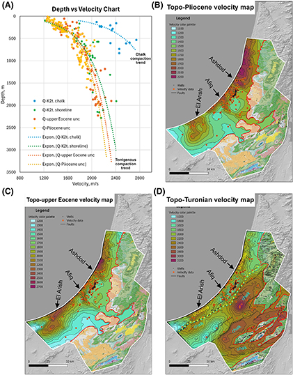 Figure 6. (A) Velocity-depth chart showing the compaction trends for the first three layers of the velocity model. (B–D) Velocity maps for the top Pliocene (B), top Late Eocene (C), and top Turonian (D), respectively. Expon. = exponent; K2t. = Turonian; Q = Quaternary; unc = unconformity.