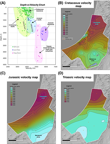 Figure 7. (A) Velocity-depth chart showing the distribution of the velocities for the “layer cake” velocity model. (B–D) Velocity maps for Cretaceous (B), Jurassic (Jura) (C), and Triassic (Trias) (D) layers, respectively. k2t = Turonian; Perm. = Permian; tend = tendency.