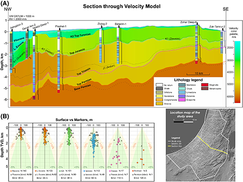 Figure 8. (A) Cross section through the velocity model (VM) with the correlated surfaces. Note the horizontal variability in the velocity. (B) Mismatch in meters between velocity model (surfaces) and actual marker depth, before the adjustment at well locations. L. = Lower; RV = replacement velocity; TVD = true vertical depth.