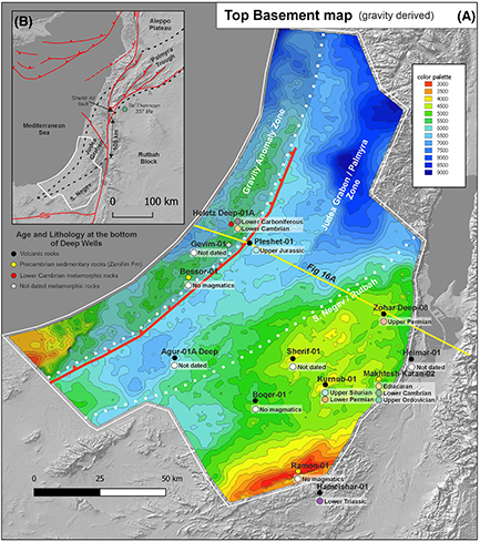 Figure 9. (A) Regional tectonic map of the area. (B) Depth to basement. The depth was calculated using residual gravity signals calibrated to wells in the area. Note the division to sublocations that correspond with the Palmyra trough in Syria. Fm = Formation.