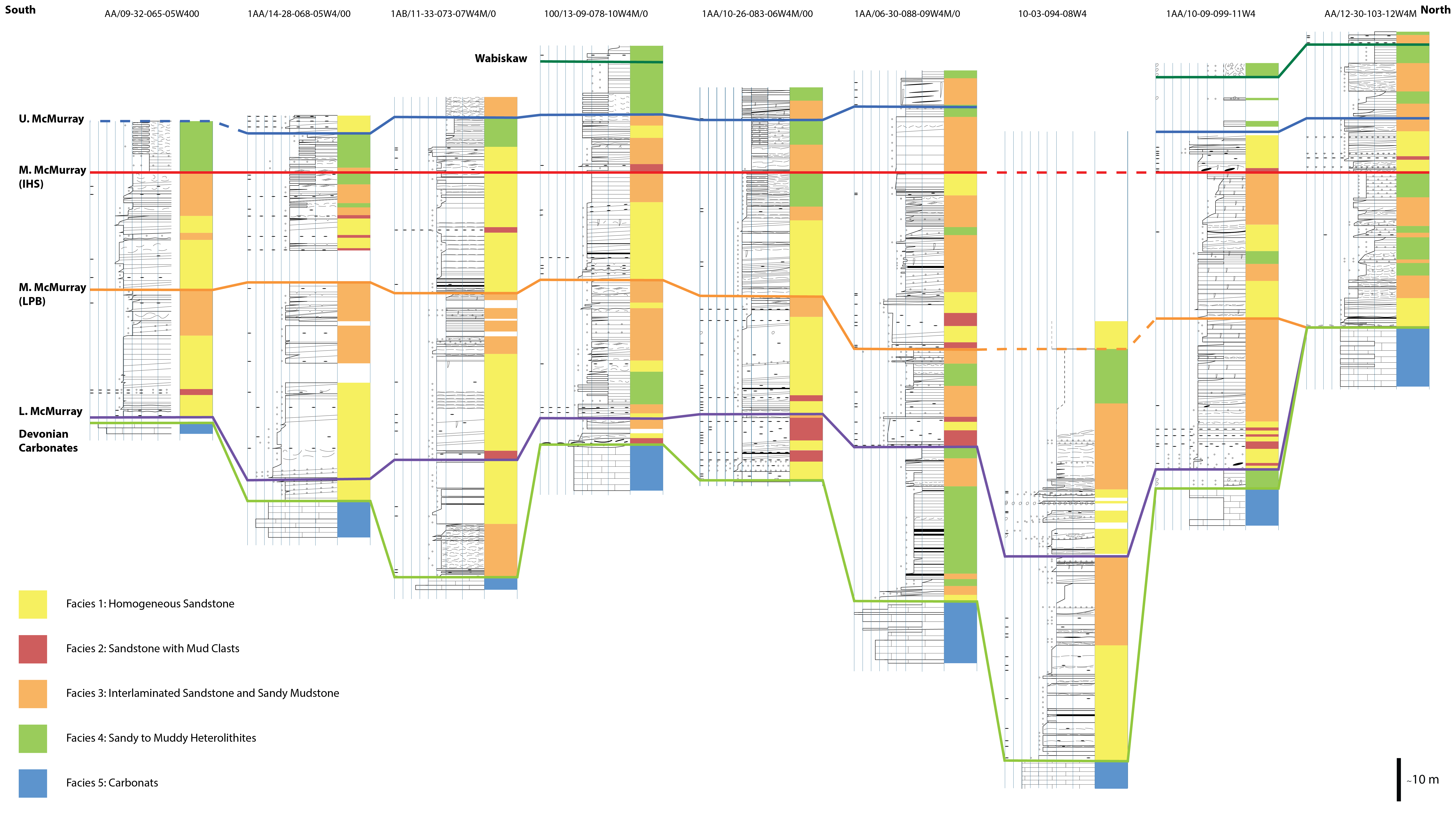 Here, we use multiple quantitative macro-, meso- and micro-scale approaches to further advance discussion of the McMurray Conundrum. First, we present published results of a recent paleogeographical reconstruction of the McMurray river system paleodrainage basin area, which places McMurray deposition within the context of a continental-scale system. We then use a high-density McMurray subsurface dataset, including published 3-D seismic observations, to test for downstream morphological and sedimentary transformations that indicate a paleogeographic position in the normal flow reach, perhaps extending into the backwater reach, which indicate that McMurray environments of deposition were terrestrial, and formed far upstream from marine influence. Last, we deploy oxygen and carbon isotope analyses of unaltered mollusk shells in the McMurray, which indicate freshwater conditions during and shortly after deposition, and provide no evidence of brackish-water marine conditions.